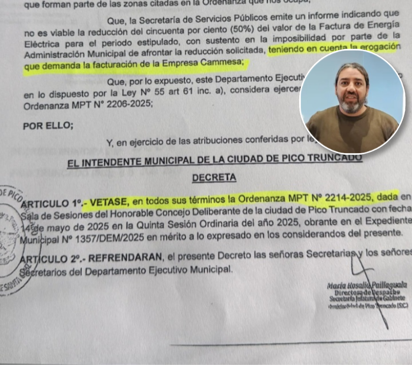 El concejal Jonathan Sandoval denunció en redes sociales que el intendente de Pico Truncado, Pablo Anabalón, vetó una ordenanza que buscaba reducir a la mitad la factura de luz para familias sin gas natural.