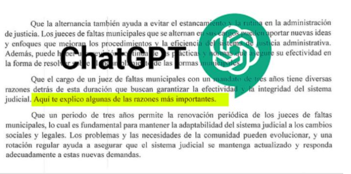 La participación de esta Inteligencia Artificial es posible indentificarse porque utiliza frases predeterminadas que se repiten siempre. Esto es posible observarse por una parte del escrito, que indica: “Que el cargo de un juez de faltas municipales con un mandato de tres años tiene diversas razones detrás de esta duración que buscan garantizar la efectividad y la integridad del sistema judicial. Aquí te explico algunas de las razones más importantes”. Esta última frase demuestra que el documento fue escrito mediante alguna de estas aplicaciones.