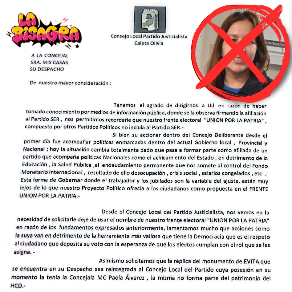 El Consejo Local del Partido Justicialista de Caleta Olivia emitió una nota dirigida a la concejal Iris Casas, en el que le solicita que cese de utilizar la identidad del frente electoral Unión por la Patria (UxP), luego de que se conociera su afiliación al Partido SER, una fuerza política que impulsa políticas de ajuste y achicamiento del Estado.