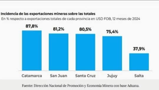 Las provincias alcanzaron los siguientes porcentajes de ventas al exterior: Catamarca: 87,8%; San Juan: 81,2%; Santa Cruz: 80,5%; Jujuy: 75,4%, y Salta: 37 ,9%.