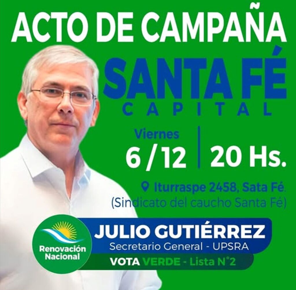 El candidato a secretario general de UPSRA por la Lista 2 Verde, Julio Gutiérrez, llevará a cabo su acto de cierre de campaña mañana, 6 de diciembre, en la ciudad de Santa Fe. El evento se realizará a las 20:00 horas en la sede del Sindicato del Caucho, ubicada en Iturraspe 2458, y contará con la presencia de trabajadores de seguridad privada de toda la región.