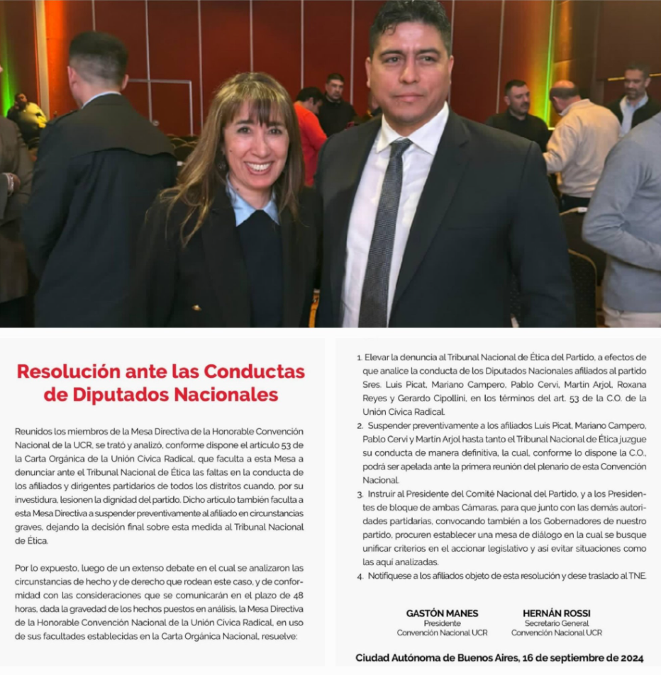La Convención Nacional de la Unión Cívica Radical (UCR) decidió analizar la conducta de la diputada santacruceña Roxana Reyes que se ausentaron de la votación durante la sesión en la que se debatía el veto del presidente Javier Milei a la suba de haberes de los jubilados. Asimismo, al igual que Reyes, el Tribunal Nacional de Ética considerará la conducta del legislador Gerardo Cipollini.