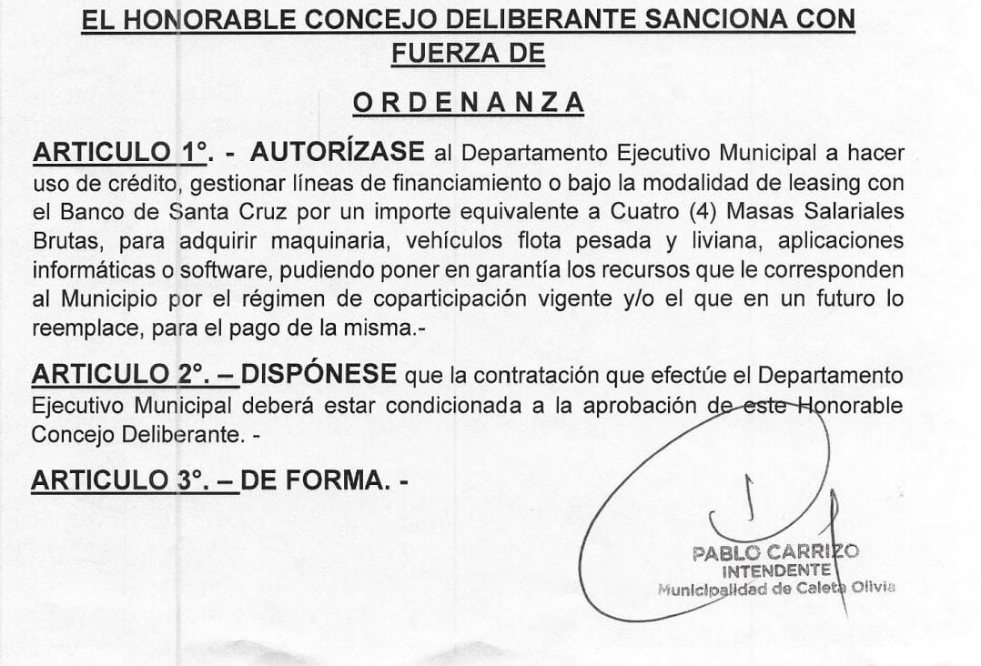 En un archivo filtrado del Concejo Deliberante y primicia de La Bisagra, se dió a conocer que el Intendente de Pablo Carrizo, mediante un proyecto de ordenanza, estaría tratando de hacer uso de un crédito bajo la modalidad de “leasing”, con el Banco de Santa Cruz por un equivalente a Cuatro (4) Masas Salariales Brutas. Poniendo en garantía recursos que le corresponden al Municipio por el régimen de coparticipación vigente y/o el que en un futuro lo reemplace para el pago de la misma.