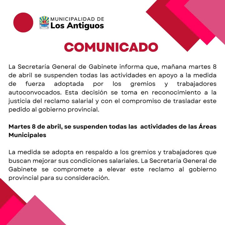 La Municipalidad de Los Antiguos suspendió este martes todas sus actividades en apoyo a la medida de fuerza impulsada por gremios y trabajadores autoconvocados, quienes reclaman mejoras salariales ante el gobierno provincial. La decisión, anunciada mediante un comunicado de la Secretaría General de Gabinete, señala que el municipio adhiere al paro “en reconocimiento a la justicia del reclamo” y se compromete a trasladar el pedido a las autoridades del gobierno Provincial.