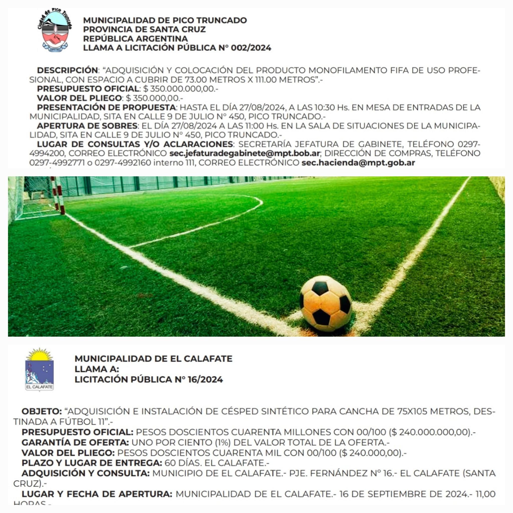 También a través del boletín oficial se conoció la licitación del municipio de El Calafate para “la adquisición e instalación de césped sintético para cancha de 75×105 metros destinada a fútbol 11”. El presupuesto oficial es de 240 millones de pesos.
