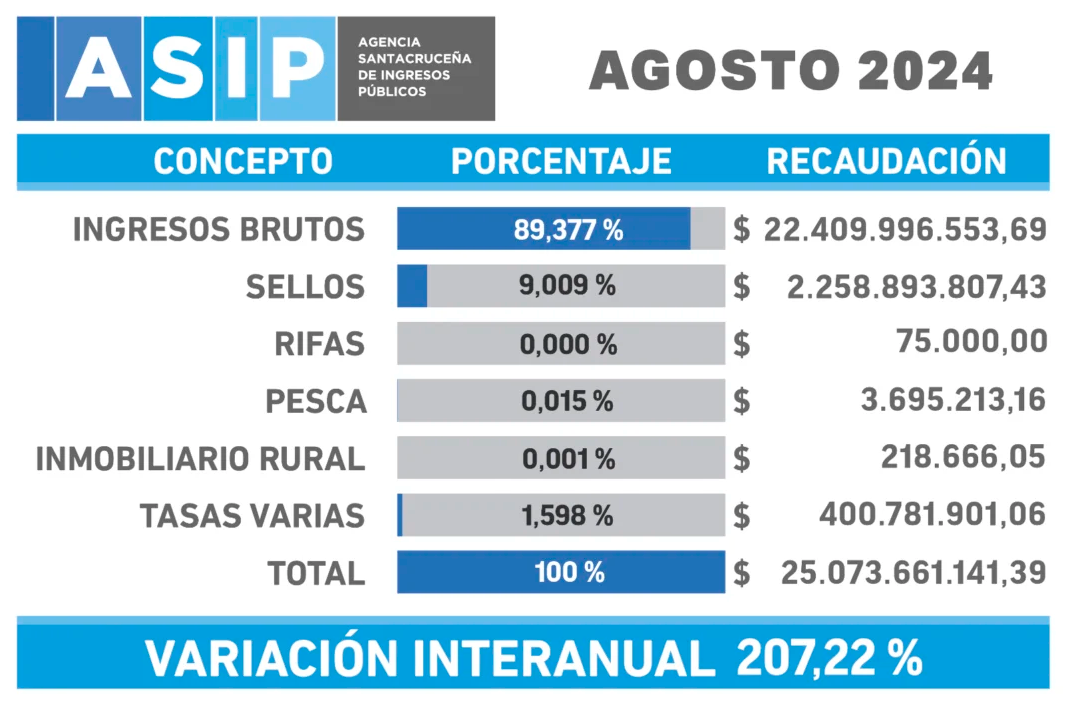 La recaudación del mes de Agosto 2024 por parte de la Agencia Santacruceña de Ingresos Públicos asciende a más de 25.073 millones de pesos, solo en concepto de impuestos internos donde el arancel recaudatorio más importante es Ingresos Brutos por un total de casi 22.500 millones de pesos. Plata hay pero, ¿dónde?