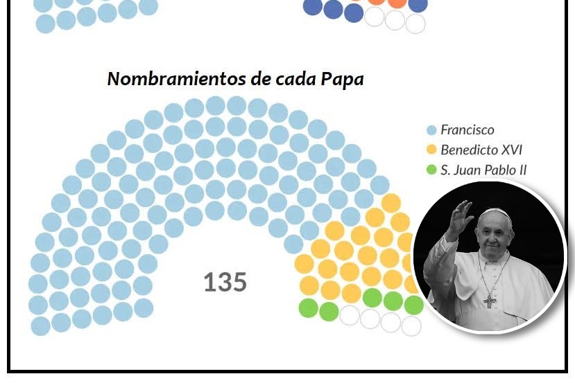 El próximo cónclave estará marcado por la fuerte influencia del Papa Francisco, ya que 108 de los 135 cardenales electores (80%) fueron nombrados por él. Esto asegura que su legado reformista tendrá un peso decisivo en la elección del nuevo Pontífice. Los otros 27 electores, designados por Benedicto XVI y Juan Pablo II, representan una minoría con menos margen de maniobra.