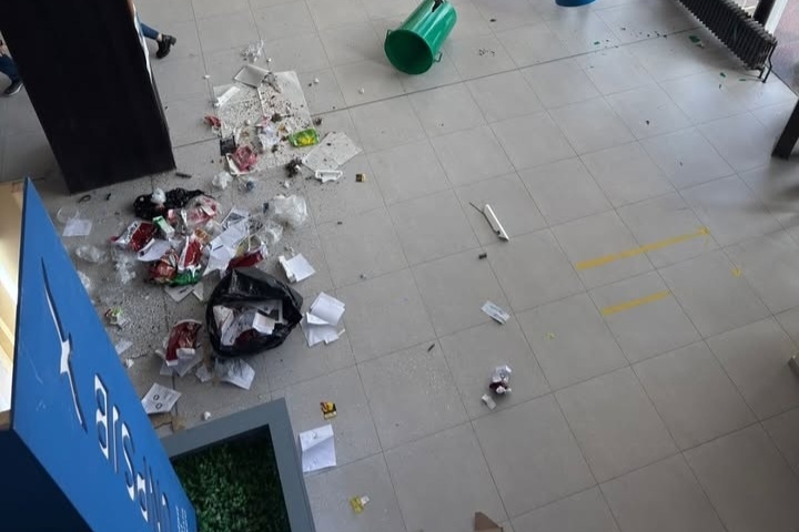 La situación se tornó más grave cuando, tras arrojar el contenido, el joven lanzó el recipiente completo. “Después de tirar el contenido tratando de obviamente ensuciar a los que estaban ahí alrededor, tira el tacho de basura directamente. Tenía cosas todavía, tenía vidrios y demás. El tacho literalmente explotó e hizo un desparramo más o menos. De hecho, hay unas compañeras que estuvieron muy cerquita que no les cayó de suerte nada más en la cabeza”, agregó.